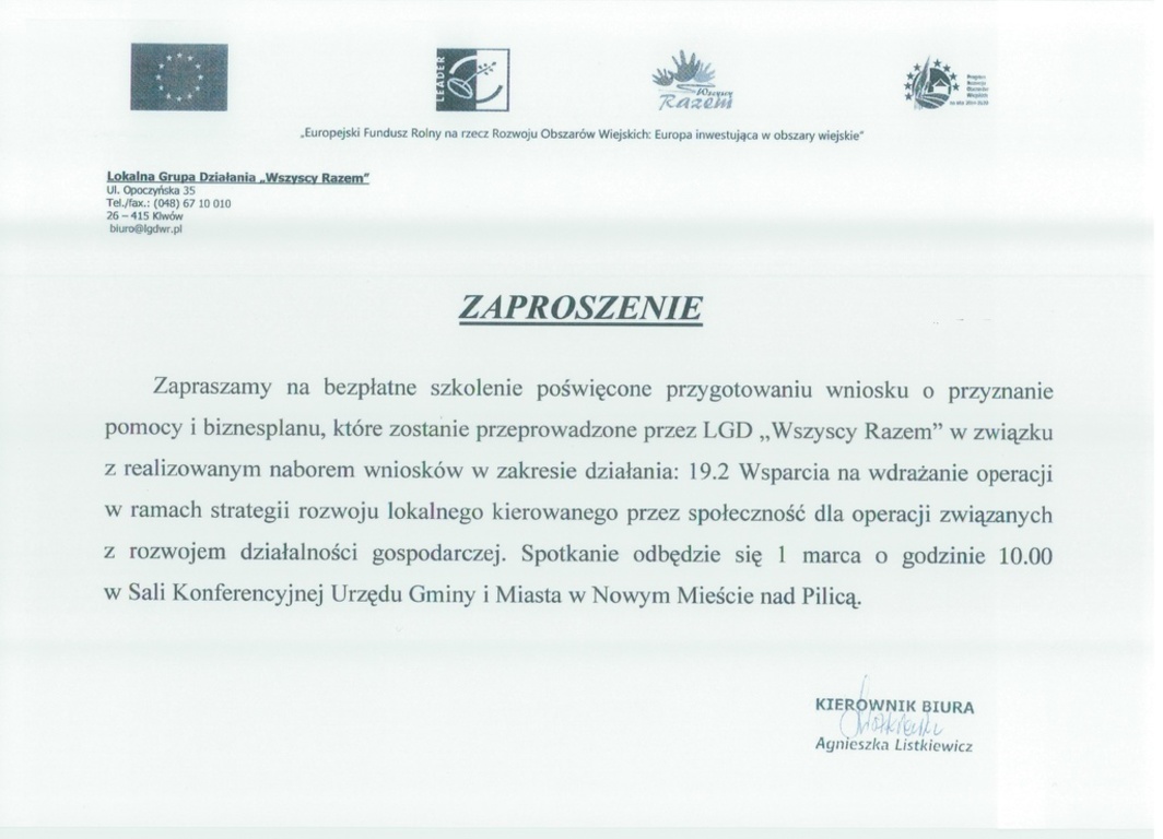 Zaproszenie na bezpłatne szkolenie poświęcone przygotowywaniu wniosku o przyznanie pomocy i biznesplanu, które zostanie przeprowadzone przez LGD "Wszyscy Razem" w związku z realizowanym naborem wniosków w zakresie działania: 19.2 Wsparcia na wdrażanie operacji w ramach strategii rozwoju lokalnego kierowanego przez społeczność dla operacji związanych z rozwojem działalności gospodarczej. Spotkanie odbędzie się 1 marca o godzinie 10.00 w Sali Konferencyjnej Urzędu Gminy i Miasta w Nowym Mieście nad Pilicą.