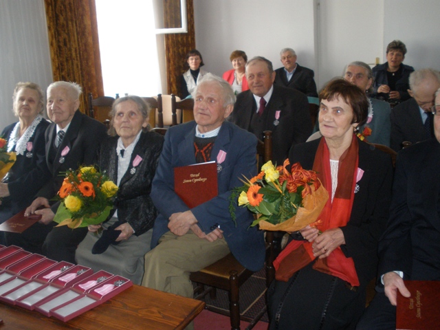 Na twarzach jubilatów, którzy oprócz medali otrzymali także od władz gminy kwiaty pojawiło się wiele razy wyraźne wzruszenie.