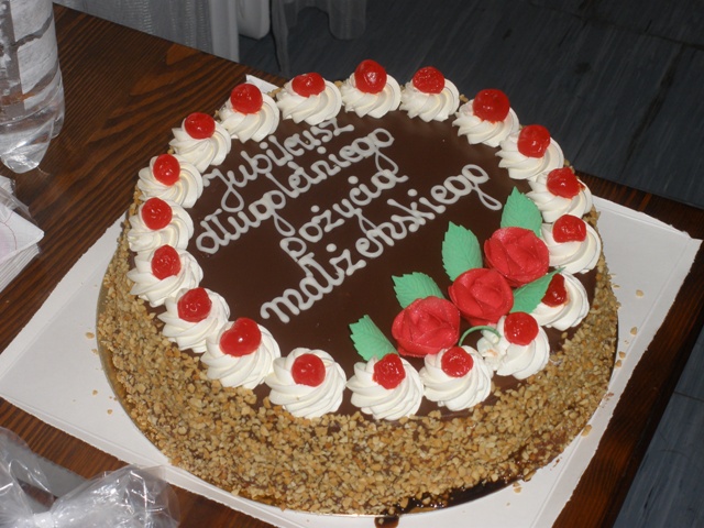 Po oficjalnej uroczystości pary obchodzące swoje złote gody wypiły po kieliszku szampana i zostały poczęstowane tortem.
