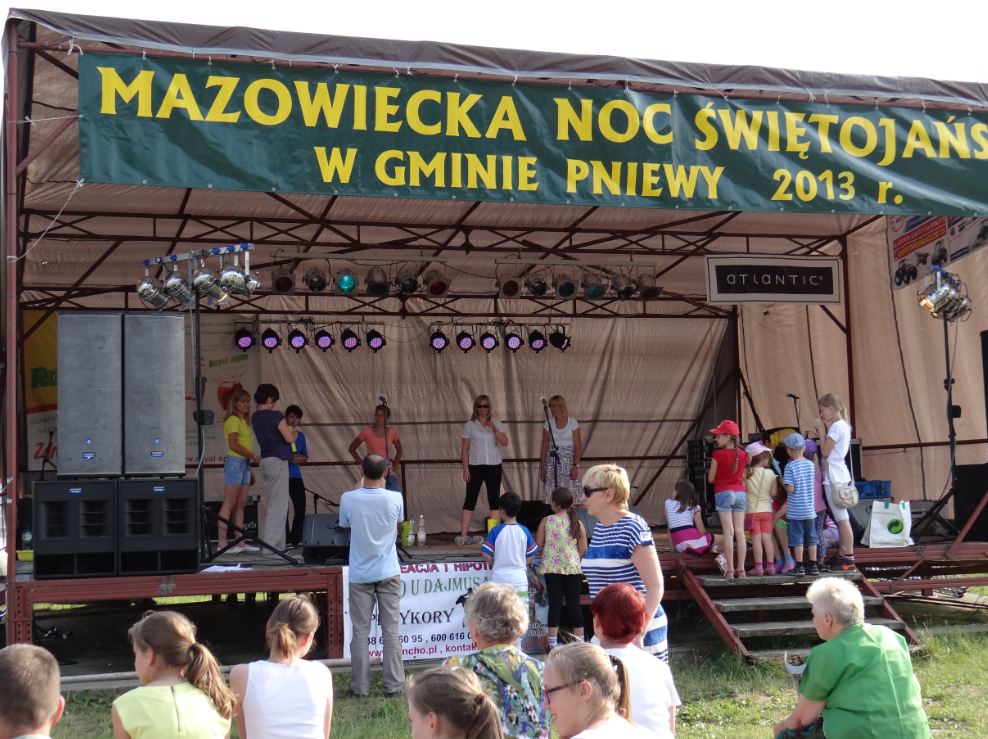 22 czerwca odbyła się VIII Noc Świętojańska w Gminie Pniewy. Jest to impreza organizowana rokrocznie w formie rodzinnego pikniku. Najmłodsi mieszkańcy Gminy pod przewodnictwem p. prezesa Stowarzyszenia Górna Jeziorka Apoloniusza Stawickiego dzielnie wmaszerowali na scenę i swoimi występami oczarowali publiczność. Zasłużyli na ogromne brawa i uznanie ze strony widowni. Następnie na scenę weszły dzieci ze szkół podstawowych, ich talenty artystyczne gromko nagrodziła publiczność. Wielkie brawa i serdeczne podziękowania ze strony Wójta Gminy za ogromne zaangażowanie i wysiłek włożony w przygotowanie każdego występu dla dzieci i nauczycieli. W roku, kiedy w życie weszła  nowa ustawa o odpadach postanowiliśmy sprawdzić wiedze naszych mieszkańców na temat segregacji odpadów i ochrony środowiska. Konkurs przeprowadziła pani Aneta Stawicka. Nagrody ufundowało Stowarzyszenie Górna Jeziorka, Firma Rekopol i Firma SITA RADOM.    Po części artystycznej Pan Wójt Wiesław Nasiłowski i Przewodnicząca Rady Gminy Zofia Rokosz przywitali przybyłych gości, powitali zgromadzonych uczestników pikniku i serdecznie podziękowali sponsorom.