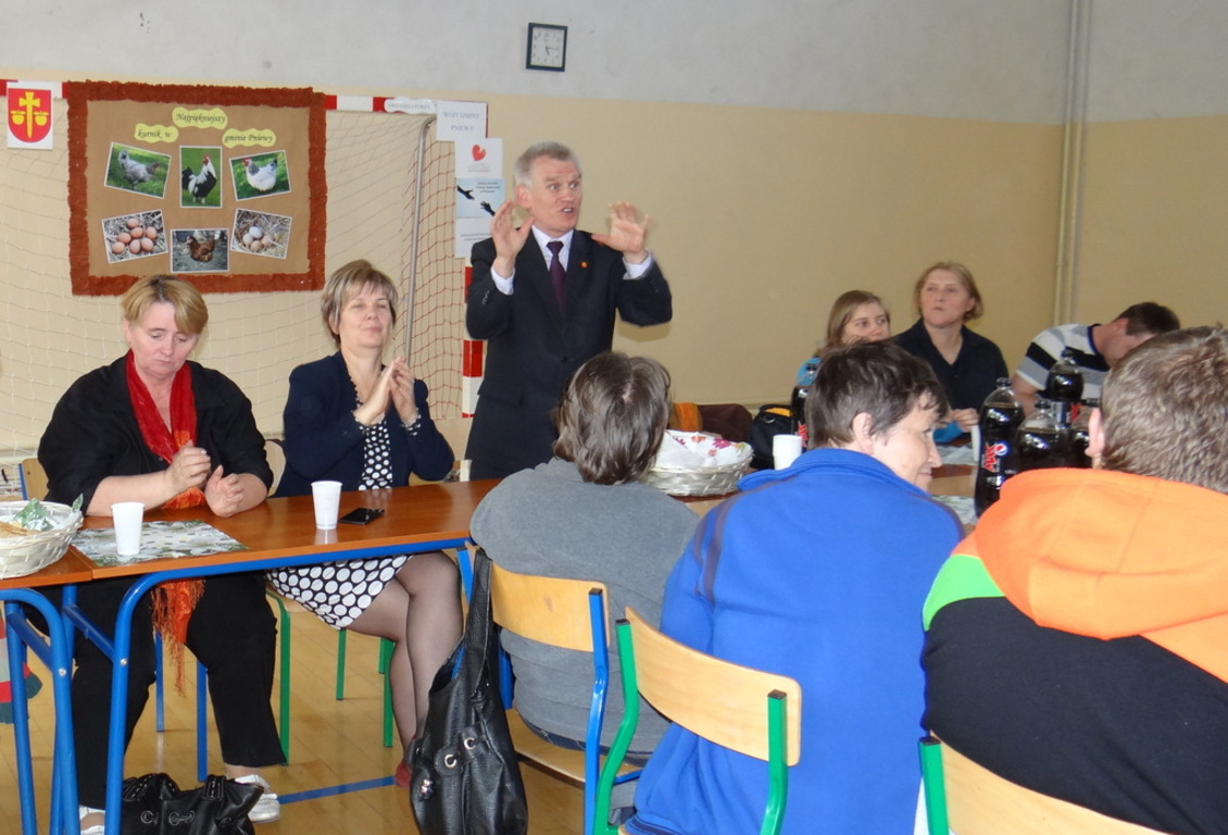 Aby podziękować rodzicom i dzieciom za zaangażowanie, pomysłowość oraz wysiłek włożony w budowę kurników, Wójt Gminy Pniewy wraz z Państwem Pietrzak i pracownikami GOPS zorganizowali spotkanie w Gimnazjum w Kruszewie. Uroczystość rozpoczęła się podziękowaniem Wójta Gminy Pniewy dla wszystkich uczestników konkursu. Każdy mógł obejrzeć tego dnia wystawę zdjęć kurników. Aby umilić oczekiwanie na werdykt powołanej przez Wójta komisji złożonej z przedstawicieli przybyłych na uroczystość mediów, Wolontariat „Dobre Serce” przygotował słodki poczęstunek.
