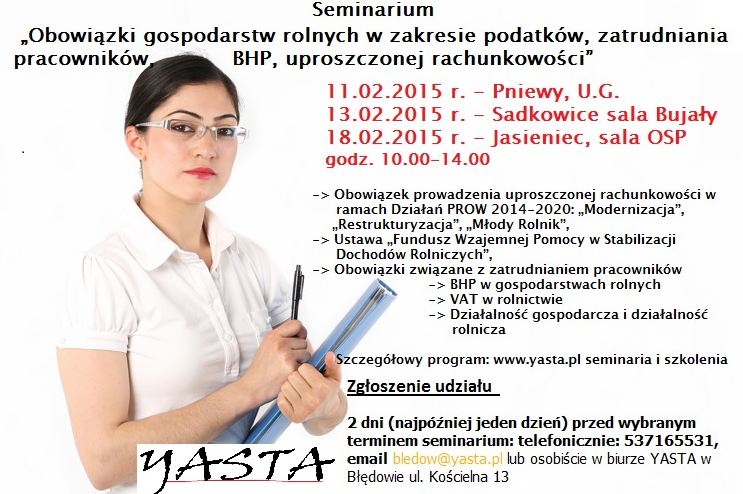 Serdecznie zapraszamy na szkolenie "Obowiązki gospodarstw rolnych w zakresie podatków, zatrudniania pracowników, BHP, uproszczonej rachunkowości", które odbędzie się 11 lutego 2015 r. w Urzędzie Gminy Pniewy o godzinie 10.00-14.00.