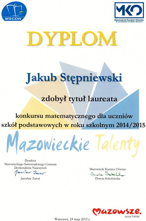 Gratulacje należą się też rodzicom Jakuba, p. Monice i Piotrowi Stępniewskim, którzy okazali synowi ogromne wsparcie w przygotowaniach do konkursu, przerabiali z nim wiele zadań matematycznych, nauczyli go dyscypliny i systematyczności oraz wytrwałości w dążeniu do celu.