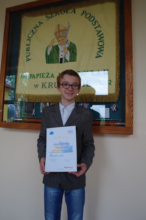 18 maja 2015r. w auli Wydziału Matematyki i Nauk Informacyjnych Politechniki Warszawskiej odbyło się wręczenie dyplomów laureatom konkursów przedmiotowych  przeprowadzonych przez Mazowieckie Kuratorium Oświaty . Wśród tych najwybitniejszych, najbardziej utalentowanych znalazł się uczeń Publicznej Szkoły Podstawowej im. Papieża Jana Pawła II w Kruszewie- szóstoklasista Jakub Stępniewski.