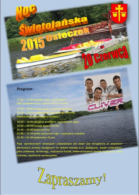 Serdecznie zapraszamy na Noc Świętojańską 2015 która odbędzie się 20 czerwca w Osieczku przy zalewie.(program proszę kliknąć ikonkę zdjęcia)
