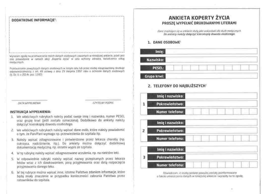 Informacja zawarta w Kopercie może uratować życie, jest bardzo ważna przede wszystkim w przypadku ludzi starszych żyjących samotnie. Koperty są bezpłatne i trafią do każdej zainteresowanej osoby w wieku senioralnym lub trwale zmagającej się z chorobą. Ankietę należy wypełnić, musza się tam znaleźć informacje na temat stanu zdrowia: chorób przebytych i tych na, które obecnie osoba choruje, przyjmowanych lekarstw, skłonności do uczuleń oraz co bardzo istotne telefony do opiekunów i osób bliskich. Wypełniona ankietę umieszcza się w plastikowej kopercie i wkłada do lodówki. Na lodówce umieszcza się naklejkę informującą o tym, że właśnie tu znajduje się koperta życia.
